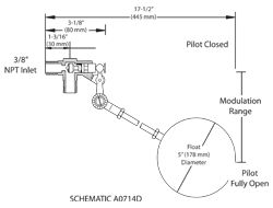 The R-400 is a modulating float pilot with a plastic float, suitable for remote installation on a tank or reservoir. It positions the main valve in proportion to the reservoir level. Standard configuration is for the pilot to close on rising level. Specify “Reverse Acting” for the pilot to open on rising level. The polypropylene float connects to the pilot on a 10 in / 250 mm brass rod.