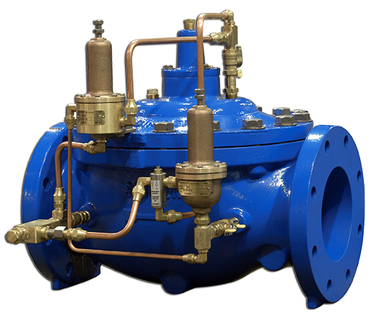 Pressure reducing pilot valve senses the downstream pressure through a connection at the valve outlet. Under flowing conditions, the pilot reacts to small changes in pressure to control the valve position by modulating the pressure above the diaphragm. The downstream pressure is maintained relatively steady at the pilot set-point.