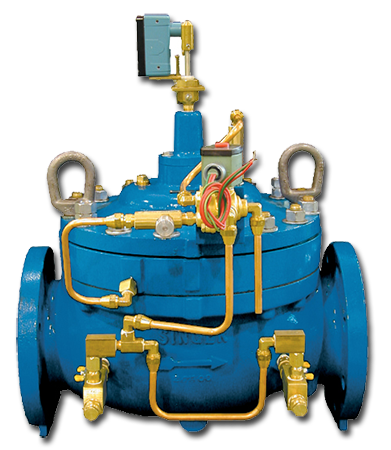 The pump control valve is normally closed and on pump start-up, a pilot solenoid is energized to open the valve, at a rate governed by the opening speed control. When shut-down is required the pilot solenoid on the valve is de-energized to commence closing. The pump is kept running while the valve slowly closes. When the valve is almost fully closed and flow is virtually zero, a stem mounted cam triggers the limit switch to stop the pump.